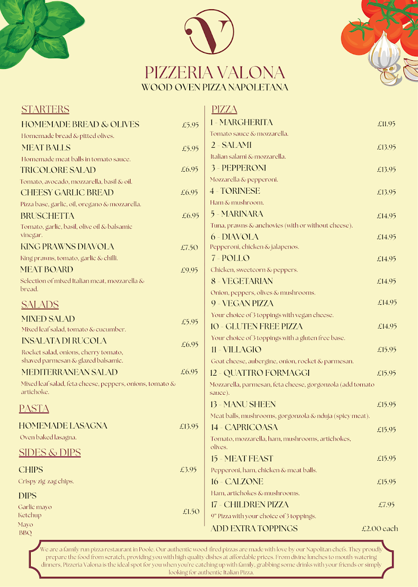 Welcome to Pizzeria Valona, where exceptional Italian cuisine meets a cozy ambiance in Poole. Nestled at 12 High St, this gem offers a menu that tantalizes with a diverse selection of pizzas, each priced at an approachable £14.95 to £15.95. Highlight dishes include the spicy Diavola and the rich Quattro Formaggi, both crafted with fresh, quality ingredients. For those with dietary preferences, options such as Vegan and Gluten-Free pizzas are also available, ensuring there’s something for everyone.
